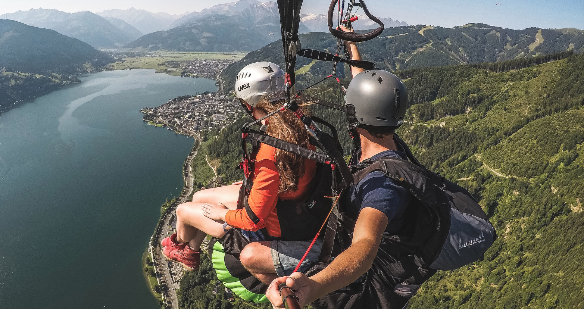 Das ist wieder von Wind- und Wetterverhältnissen abhängig: „Wir bieten den Classic Flug von der Schmittenhöhe bis ins Tal an, der ca. 15 bis 30 Minuten dauert“, sagt Sepp. Ein wunderbarer Einstieg mit viel Zeit für das Panorama. Wem dieser Adrenalinkick aber noch nicht genug ist, der ist beim Action Flug gut aufgehoben: Dieser ist zwar mit etwa 10 Minuten ein bisschen kürzer, aber gespickt mit Loopings, Spiralen und extremen Kurvenwechseln, dem Wing Over. Bei allen Flügen stehen aber die Präferenzen der Gäste im Vordergrund: „Wir richten uns immer nach den individuellen Wünschen unserer Kunden und passen uns während des Flugs nach Möglichkeit an.“